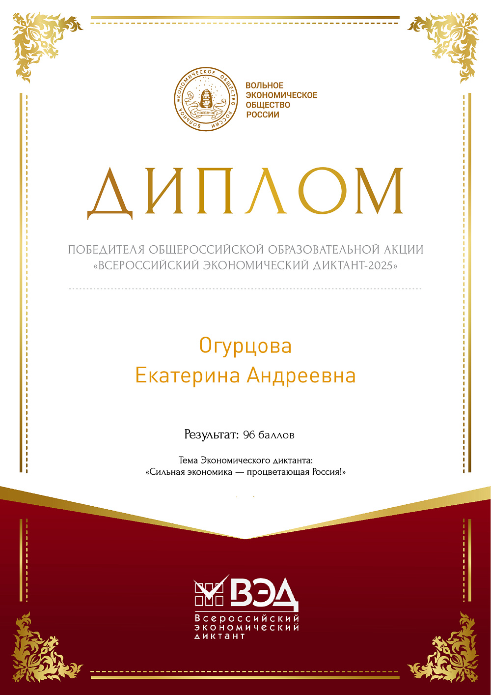 After participating in the dictation, Nikolai Churikov, a second-year student at the Faculty of Economics and Management (FEM), said he successfully answered questions covered in the courses "Economic Theory" and "Organizational Economics." Isa Magerramov, a postgraduate student at the Department of Construction Economics and Housing and Utility Infrastructure, also shared his impressions of the event: "This campaign is an important tool for improving citizens' financial literacy; it fosters interest in economics, which is especially relevant in a rapidly changing world." Ekaterina Ogurtsova, a third-year student at FEM, received a winner's diploma after completing the economics dictation, scoring 96 points out of a possible 100.