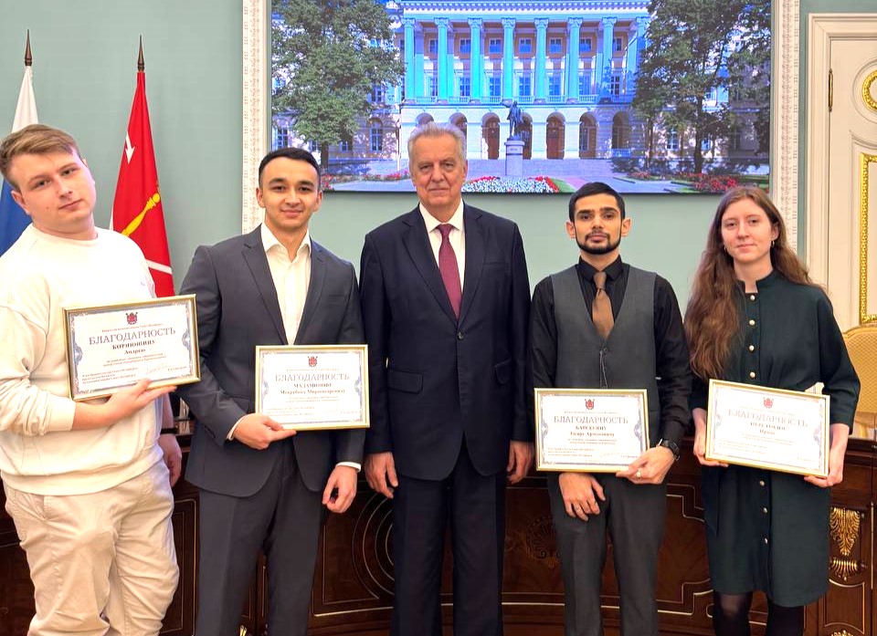 Среди награждённых – представители СПбГАСУ, проявившие высокую активность в учебной и общественной деятельности в 2025 году: Эдгар Барсегян, Ирина Перетокин, Андрей Корнюшин и Мехрубон Мадаминов.