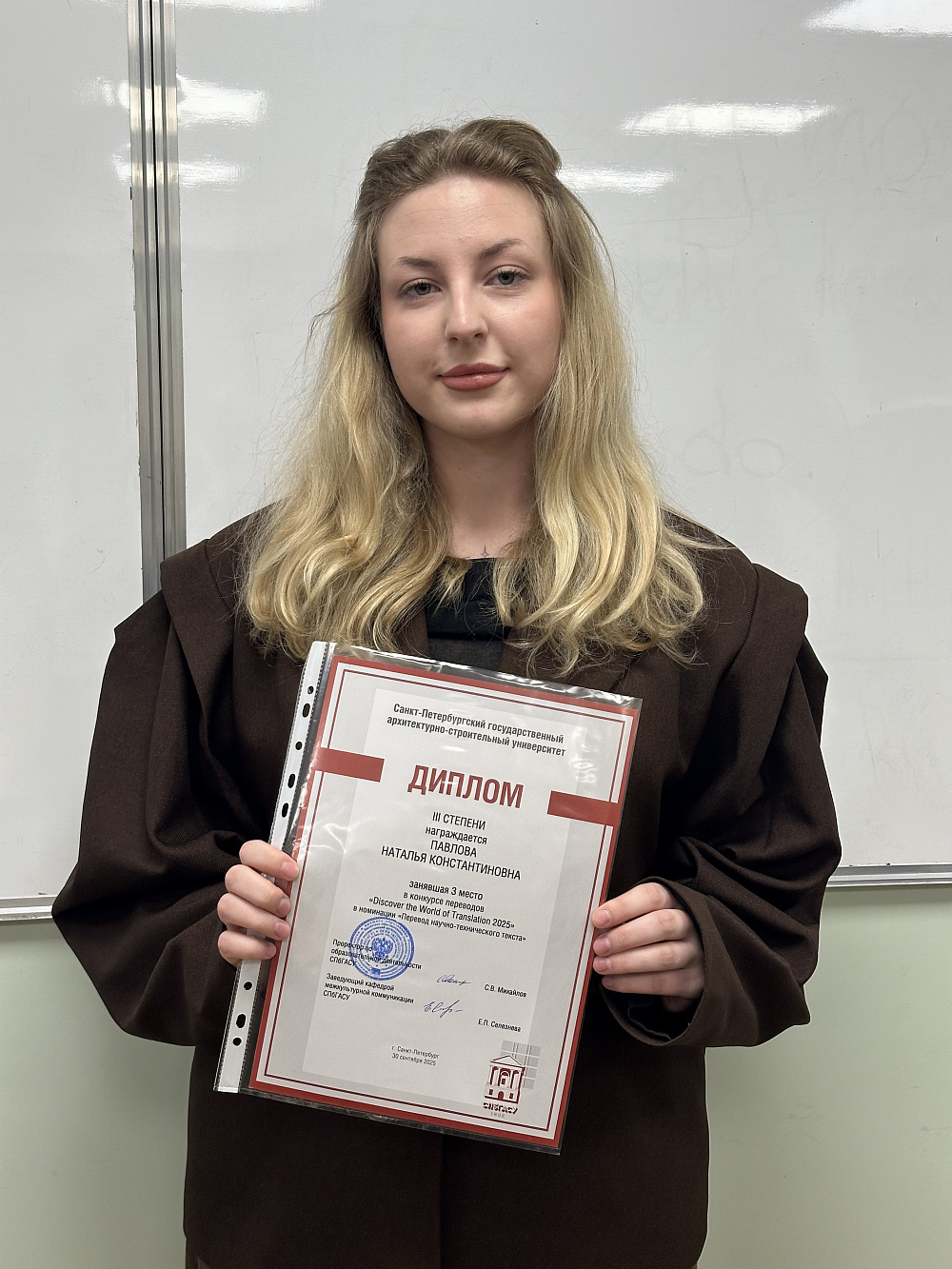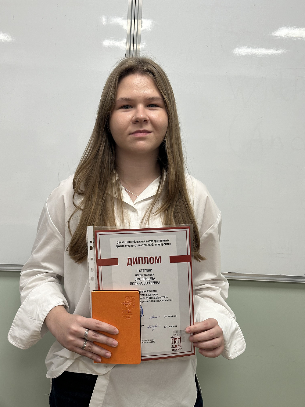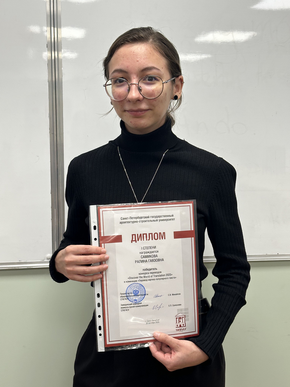 В номинации «Перевод научно-популярного текста» победу одержала Ралина Самикова, студентка третьего курса бакалавриата строительного факультета. В номинации «Перевод научно-технического текста» лучшей стала Алина Филатова, студентка четвёртого курса бакалавриата архитектурного факультета. Обе студентки – слушательницы программы профессиональной подготовки «Переводчик в сфере профессиональной деятельности».