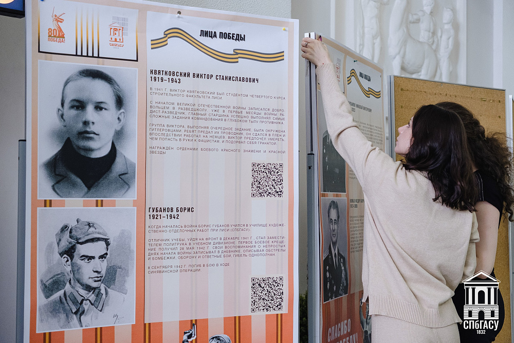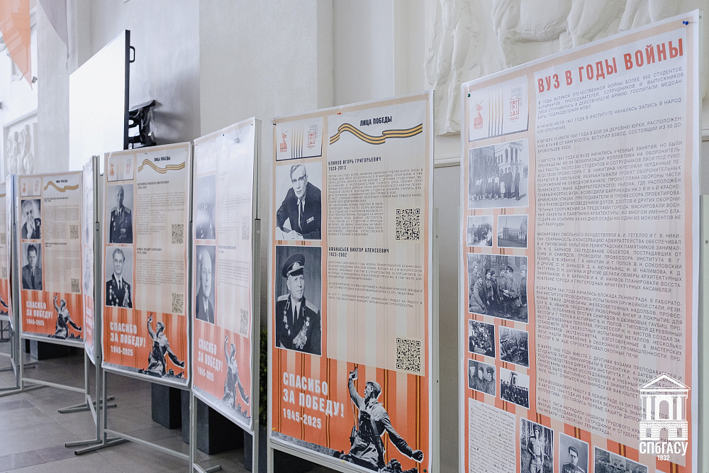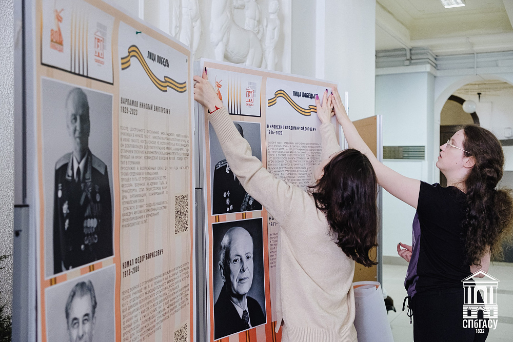 В главном холле Санкт-Петербургского государственного архитектурно-строительного университета развернулась историко-патриотическая выставка «Лица Победы», посвящённая годовщине Победы в Великой Отечественной войне. Экспозиция объединяет архивные фотографии, биографии и документальные материалы о студентах, преподавателях и выпускниках вуза, чьи судьбы оказались неразрывно связаны с войной.