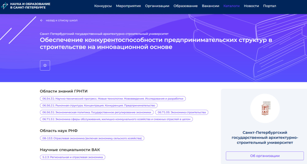 Научная школа «Обеспечение конкурентоспособности предпринимательских структур в строительстве на инновационной основе» при Санкт-Петербургском государственном архитектурно-строительном университете включена в обновлённый Реестр ведущих научных и научно-педагогических школ Петербурга.