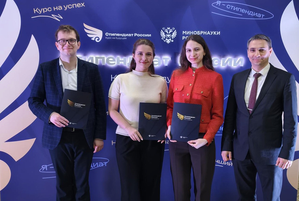 Стипендиаты строительного факультета на вручении стипендии Правительства России: Олег Яцковец, Екатерина Буряк и Злата Золотых. Справа – декан Андрей Никулин