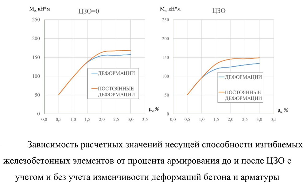 - учёт изменчивости деформационных характеристик бетона при малых процентах армирования (до 1%) в условиях знакопеременных температур практически не влияет на значение несущей способности, а при больших процентах армирования приводит к снижению значений несущей способности;