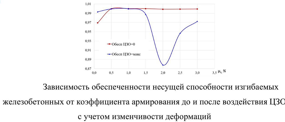 - при отсутствии ЦЗО при любом проценте армирования и при воздействии ЦЗО при малом проценте армирования (до 1,5%) обеспеченность не ниже требуемых значений. При воздействии ЦЗО при большом проценте армирования обеспеченность становится ниже требуемой;
