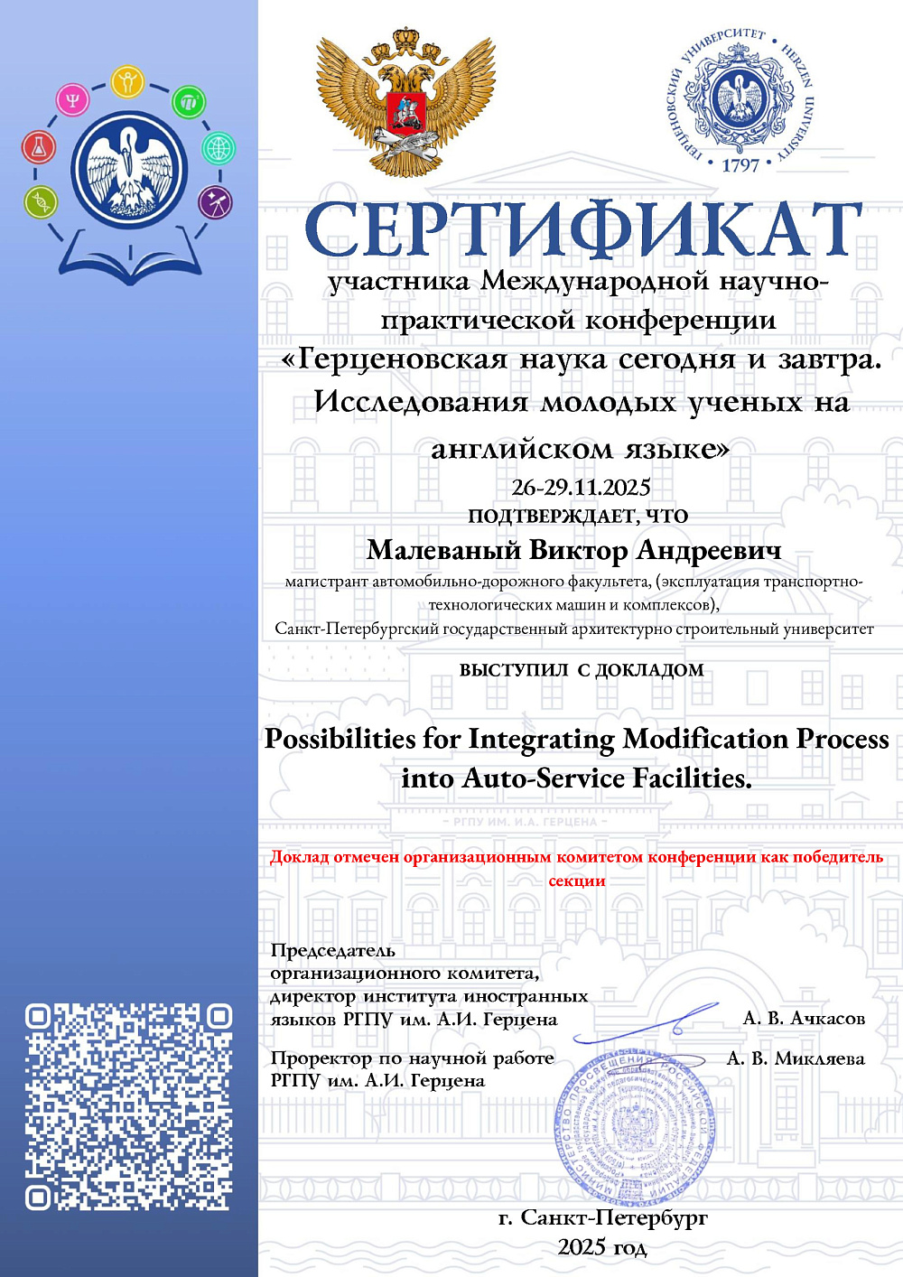 Студент первого курса магистратуры автомобильно-дорожного факультета СПбГАСУ Виктор Малеваный 26 ноября принял участие в 3-й Международной научно-практической конференции, посвящённой 80-летию Победы в Великой Отечественной войне, «Герценовская наука сегодня и завтра. Herzen Science Today and Tomorrow» на английском языке. Мероприятие было организовано Институтом иностранных языков и кафедрой английского языка для профессиональной коммуникации Российского государственного педагогического университета им. А. И. Герцена.
