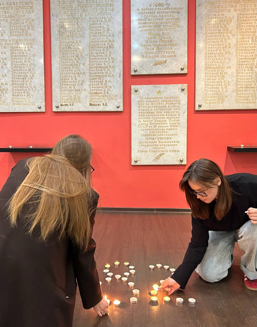 В стенах университета состоялась акция «Свеча памяти»: у Досок Памяти на верхней балюстраде, где выбиты имена студентов и преподавателей нашего вуза, сражавшихся в годы Великой Отечественной, зажглись свечи в память о защитниках города. Каждый огонёк символизировал не только скорбь о жертвах блокады, но и стойкость, мужество и непокорённый дух людей, благодаря которым выстоял Ленинград.