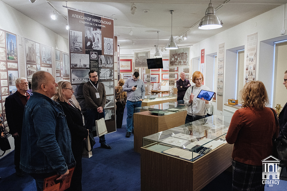 Программа конференции продолжилась посещением тематических выставок, посвящённых истории и направлениям научной деятельности университета. Участники осмотрели экспозицию «Архитектура и строительное мастерство: научные издания, творческие проекты XVII–XIX вв. из коллекции Института гражданских инженеров» в научно-технической библиотеке СПбГАСУ, а также экспозицию «История СПбГАСУ» в Историко-информационном центре университета.
